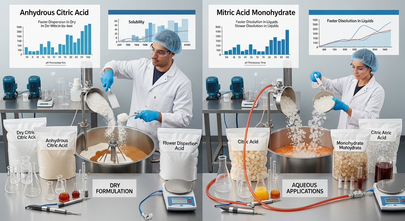 - محیط انحلال: اگر اسید سیتریک قرار است در محلول آبی حل شود، هر دو فرم به خوبی حل میشوند، اما فرم خشک ممکن است کمی سریعتر حل شود. سرعت انحلال میتواند در فرآیندهای تولید با زمان محدود، عامل مهمی باشد.