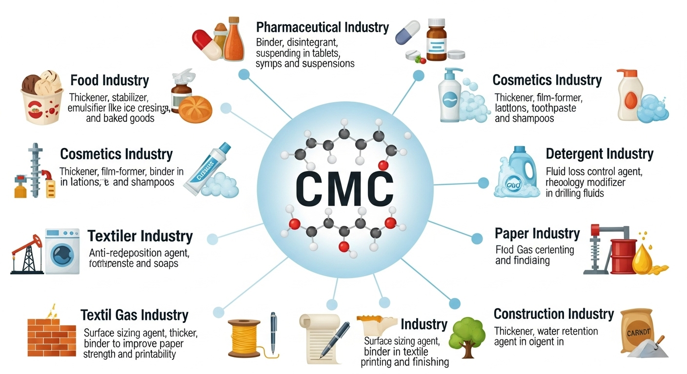 CMC به دلیل خواص منحصر به فرد خود، از جمله قابلیت غلیظکنندگی، پایدارکنندگی، ایجاد بافت، اتصال، و حفظ آب، در طیف گستردهای از صنایع مورد استفاده قرار میگیرد: